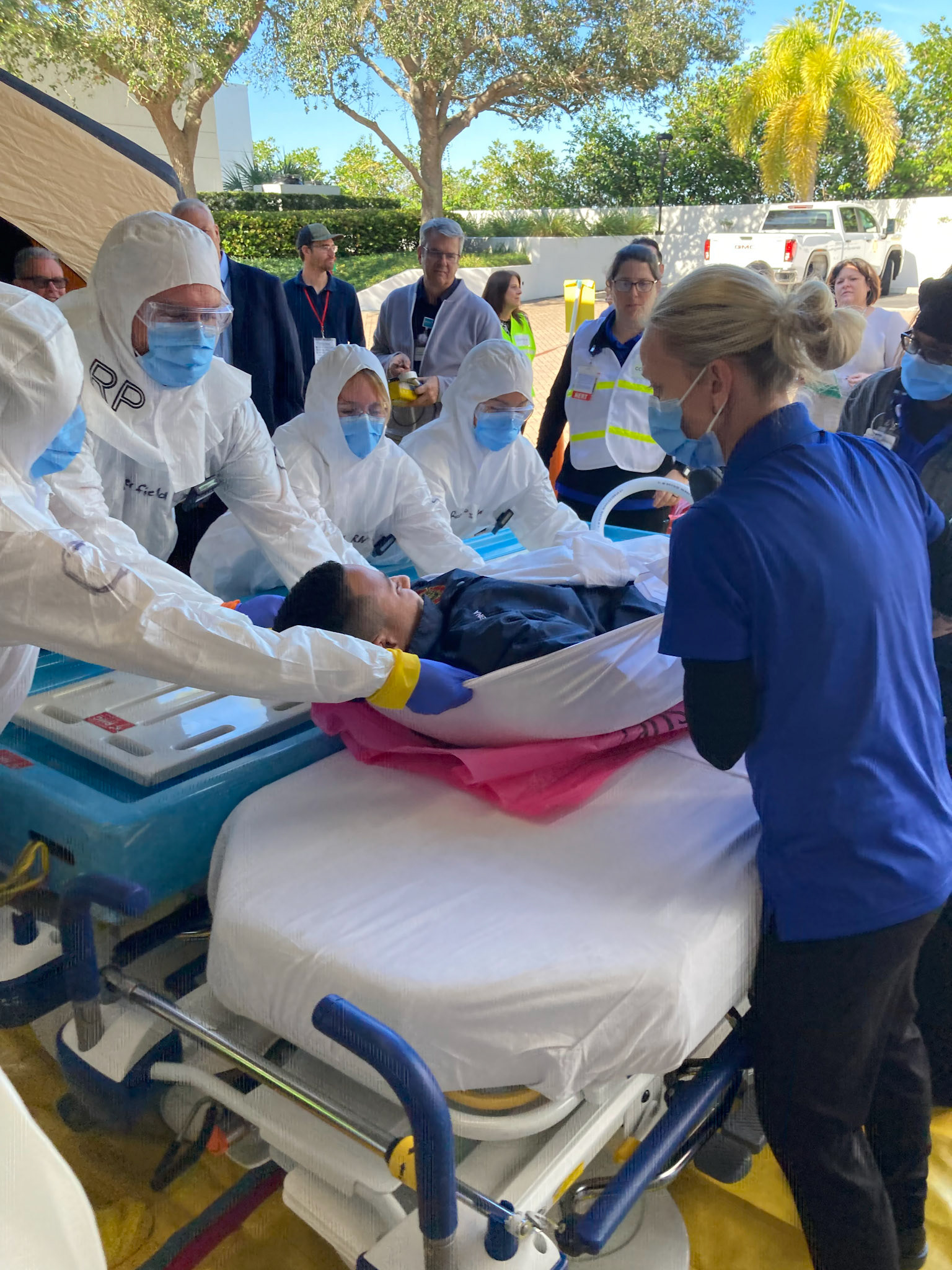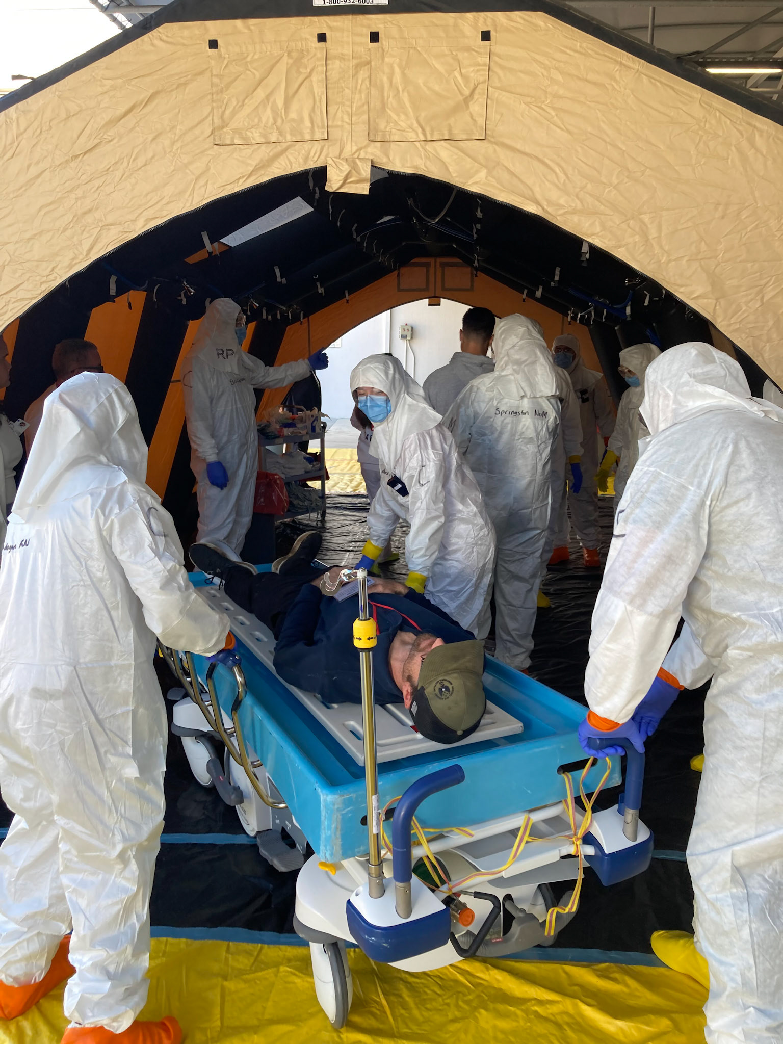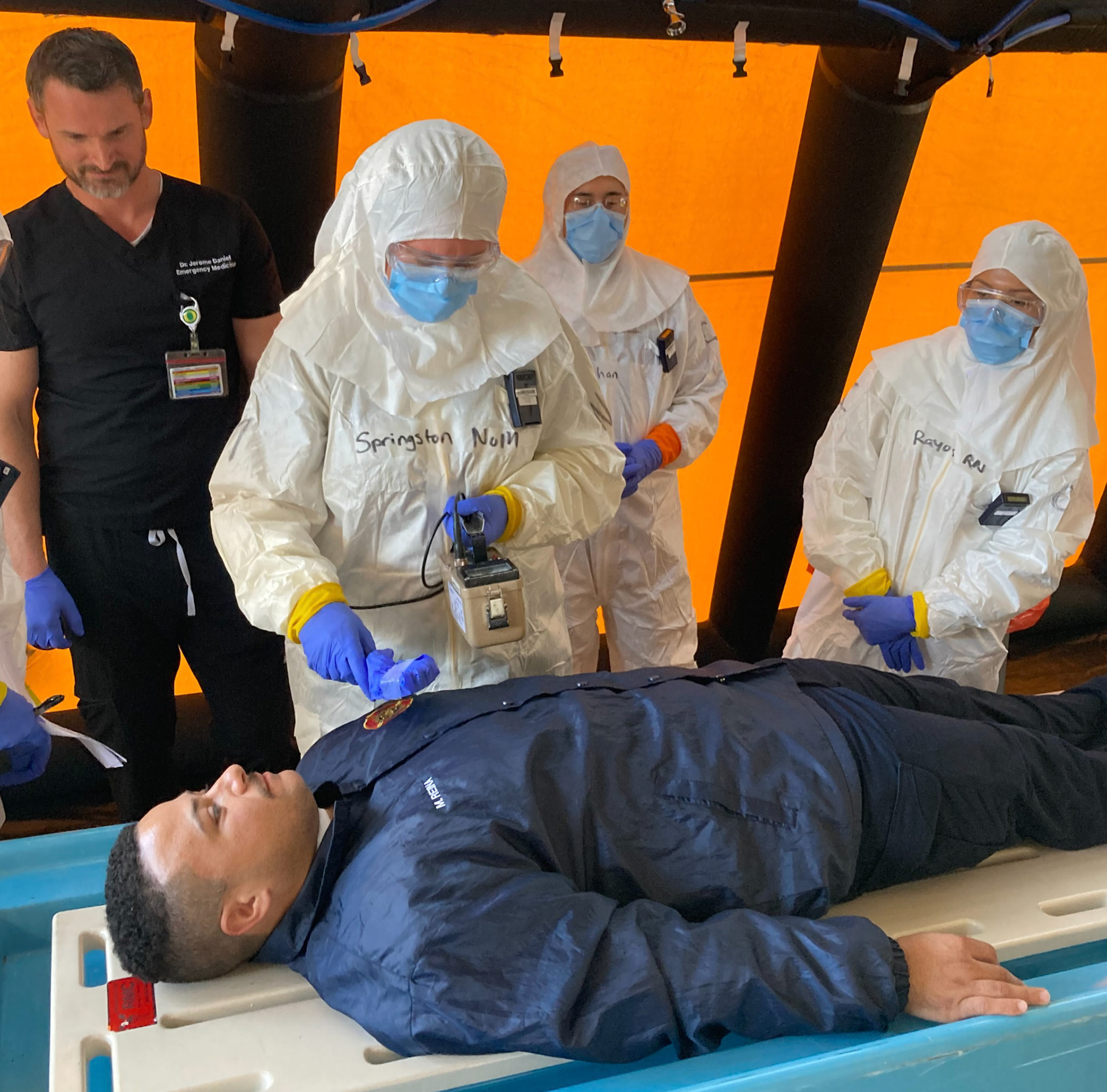Outside a local hospital emergency room, actor patients were decontaminated from simulated radiological exposure according to protocols by hospital personnel.