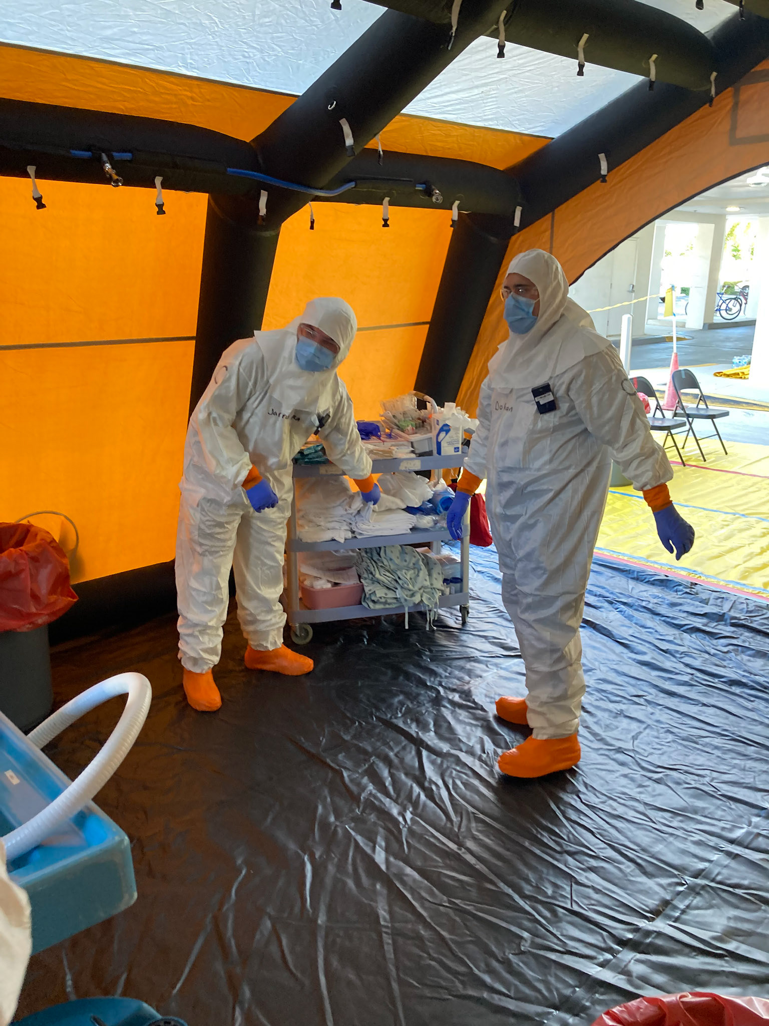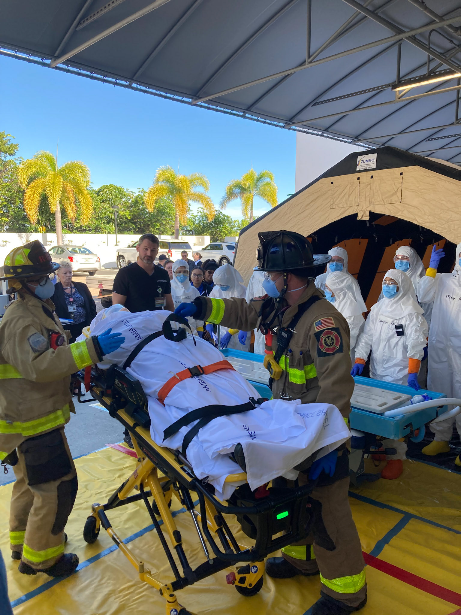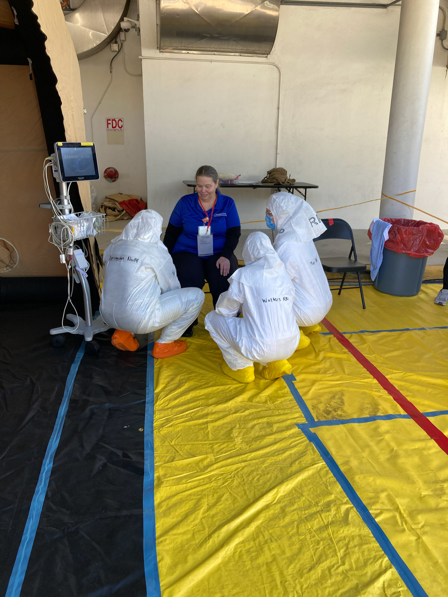 Outside a local hospital emergency room, actor patients were decontaminated from simulated radiological exposure according to protocols by hospital personnel.